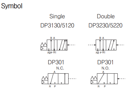 - Model DP 300: Là van 3 cửa 2 vị trí ( 3/2). Cửa cấp khí ( P), cửa đi sử dụng( A ), cửa xả ( R ).