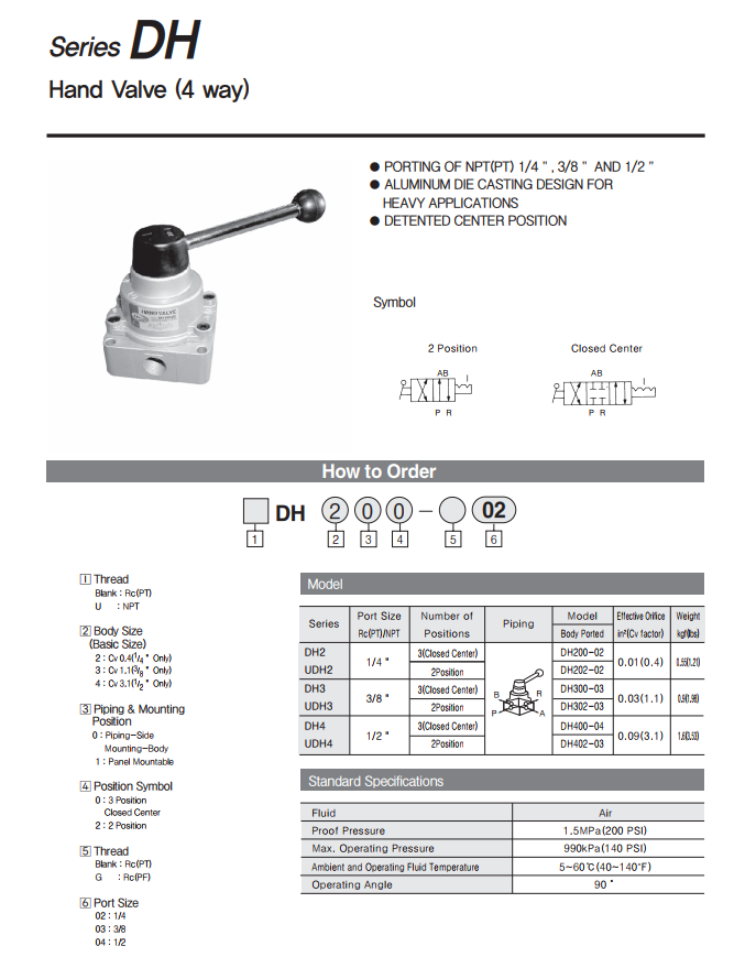 Model: DH là van tay gạt để điều khiển khí nén đi sử dụng.