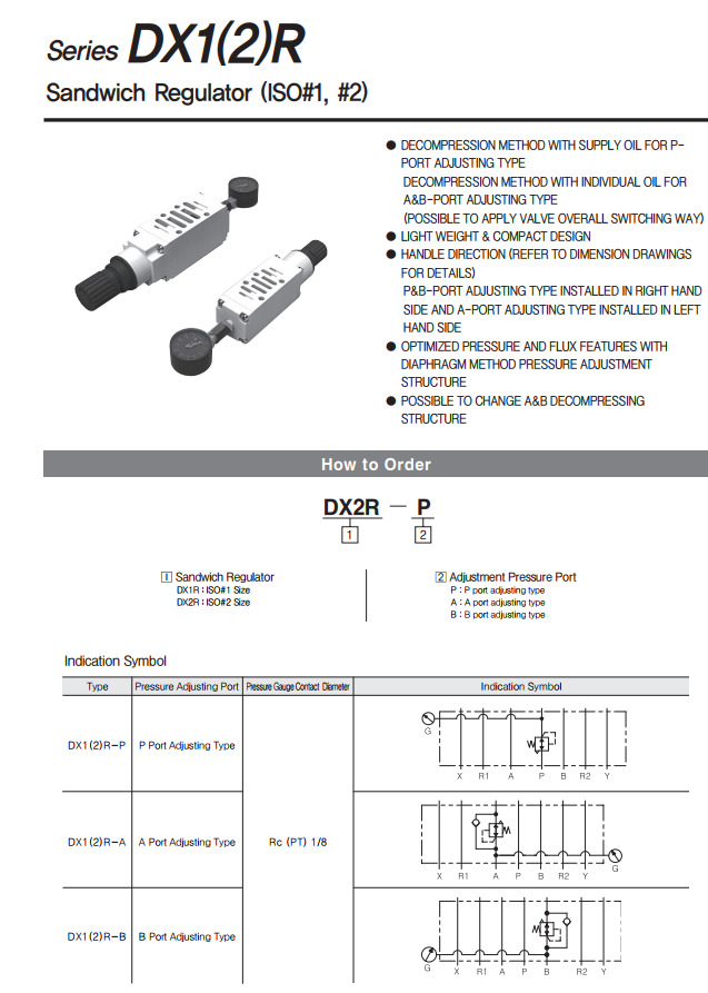 Module chỉnh áp DX1 ( 2 ) R có chức năng trực tiếp chỉnh áp lực cho van điện từ kiểu lắp module, module chỉnh áp có thể lựa chọn điều chỉnh áp cửa P, điều chỉnh áp cửa A và điều chỉnh áp cửa B