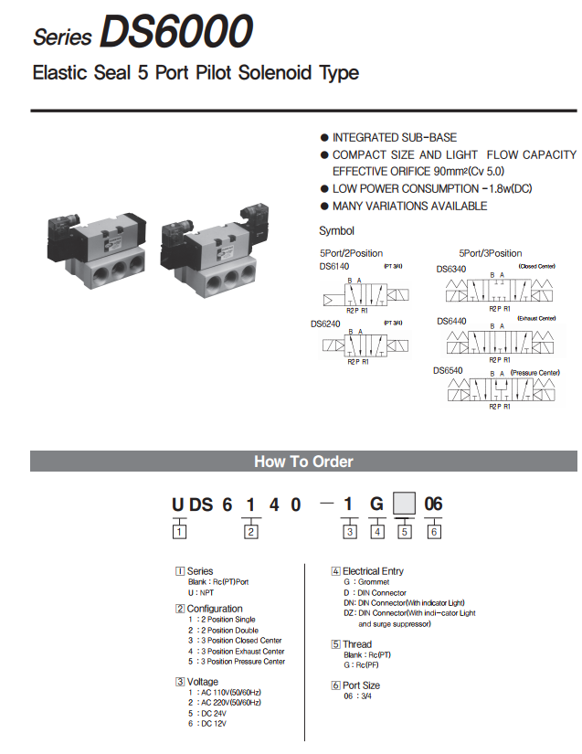 Series DS 6000: là van điện từ 5 cửa được lắp ghép trên một đế để dẫn khí và xả khí, van có size lớn điều khiển bằng cuộn hút.