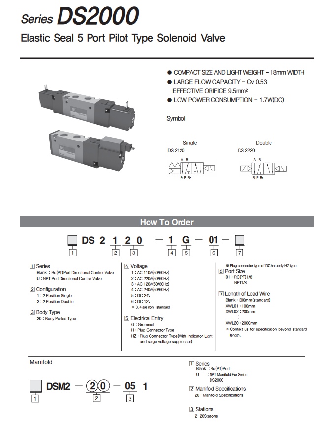 Series DS 2000 có thiết kế nhỏ gọn, phù hợp với thiết bị sử dụng lưu lượng như: Xi lanh tròn, xi lanh compact có đường kính nhỏ. Điện áp :12V - 24VDC, 110V - 220 VAC /50 Hz.