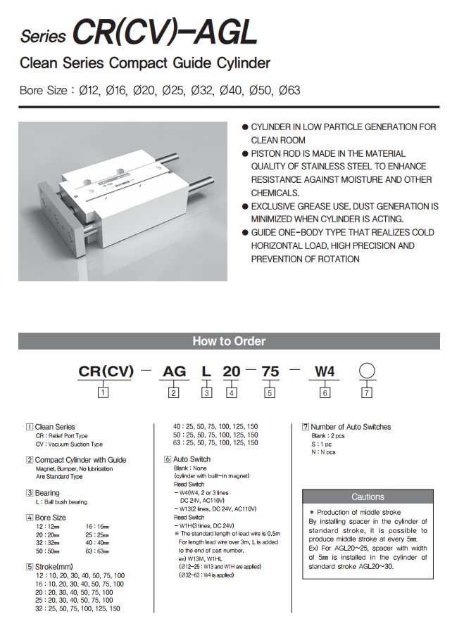 Xi lanh dẫn hướngCR (CV) được thiết kế kiểu compact, có 2 trục dẫn hướng ở hai bên, trục piston ở giữa đều được làm bằng thép không gỉ thân là hợp kim nhôm chống bám bụi. Xi lanh có chức năng sinh công tạo lực ép, nén, đẩy và được lắp đặt ở nhiều tư thế vị trí khác nhau.