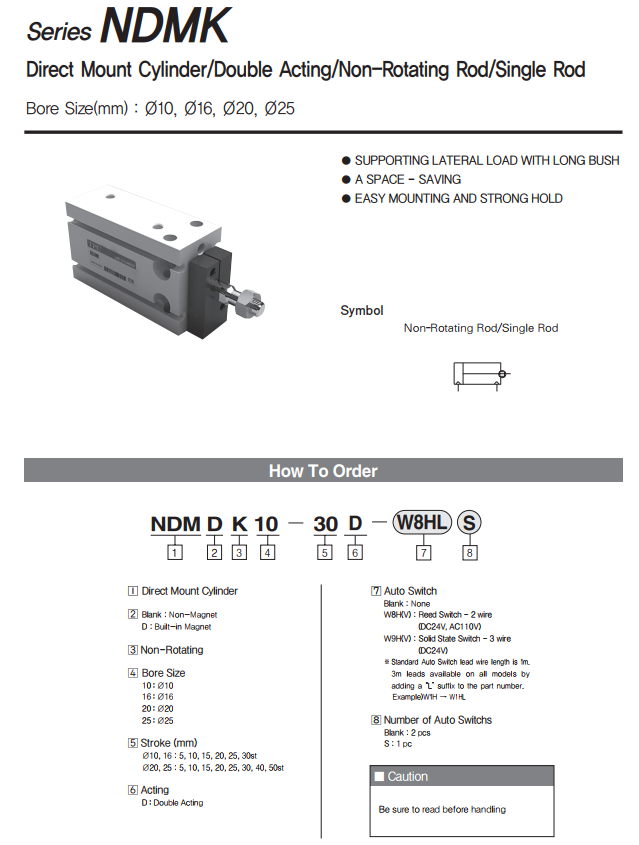 Xi lanh NDMK là dòng xi lanh đế được đúc liền thân trên đế có lỗ bắt định vị vị trí cho lắp đặt, lỗ này có thể lựa chọn trước cho vị trí lắp đặt của xi lanh. Xi lanh NDMK được thiết kế chống xoay trục bộ phận này được gắn ở đầu xi lanh.