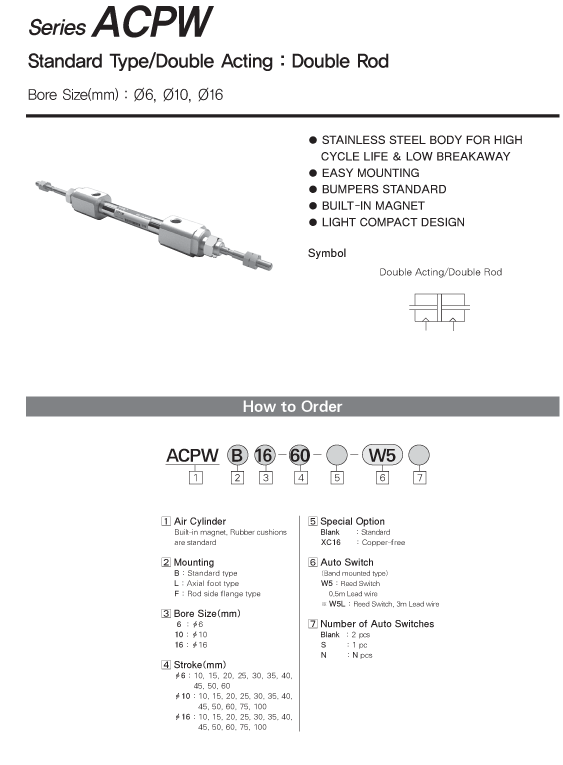 Xi lanh ACPW sử dụng 2 đầu trục, tác động kép, thân nhỏ hành trình ngắn rất thuận tiện cho nhu cầu lắp đặt cần lực ép nhỏ, tiết kiệm không gian sử dụng cả 2 chiều đẩy và kéo.